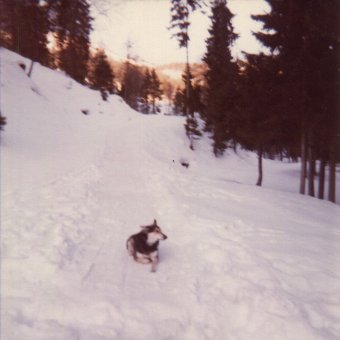 One of the few remaining photos of my dear old departed dog, the only member of the company who didn't stink (figuratively speaking), prepared to lie patiently in the cold snow until I'd finished taking pictures.