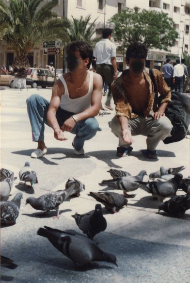 The strange thing about this photo is not that the people clearly in view have literally had their faces blacked; that is a matter of respecting their anonimity and was done before it occurred to me that using skin colour instead of black looks a bit less sinister. Two people feeding pigeons; this picure could have been taken in Amsterdam or on Trafalgar Square. Far back on the left, however, is what looks like a giant sprouting pineapple. I don't know what kind of tree it is; something, er, tropical? By the way, the photo was taken in El Aioun, Morocco.