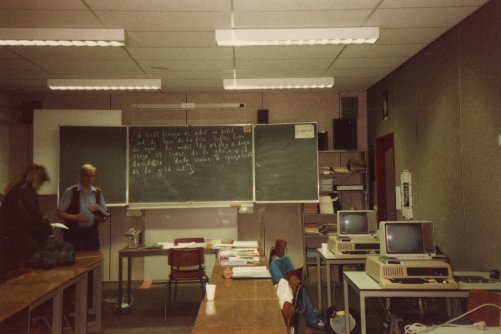 Speaking of dusty: the old, old computers used in a school in Diemen which experimented for a year with a great diversity of studies before settling down to teaching economy and nothing but that. Or maybe it's just their casing that makes them look ancient. This was when WordPerfect 4.2 (for MS-DOS) was the most widely used word processor, so they're probably 8086 machines. They may still be in use, or they may have been ripped out and donated to a museum.