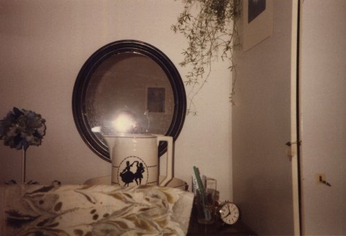 Making a pic of a still life with jug, using the flashlight because the pic was taken indoors, I hadn't thought of the mirror. Now, it looks as if a ball of light is rising from the jug. A genie-in-a-jug effect, as it were.
