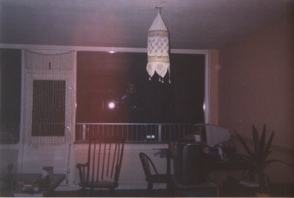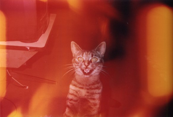 More misapplied light: I tried to capture both the hanging lamp (yes, that tasseled tent thingie) and its reflection in the dark window, but chiefly captured my own flashlight. Then I accidentally opened the camera before the film was rewound, causing ugly exposure blotches. Now it looks as if the cat is in some kind of inferno.