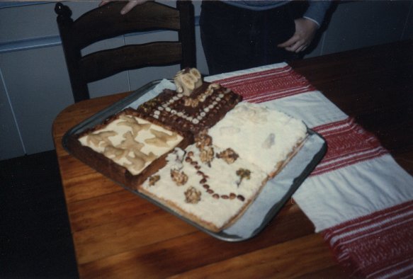 Strange impulses: I'm useless in the kitchen. But for my eighteenth birthday, I decided to be creative and bake something representing the four seasons. There's a cocos-dusted Winter section with sheepies in warm woolly coats, a Spring section with a house (the house is marzipan, the roof banana chips) and a garden laid out with halved hazelnuts, a Summer section of marzipan horses in cheesecake pasture (sadly, the creatures would not remain upright) and and Autumn section with walnuts posing as withered brown tree foliage. Then came the next step: having to eat this stuff...