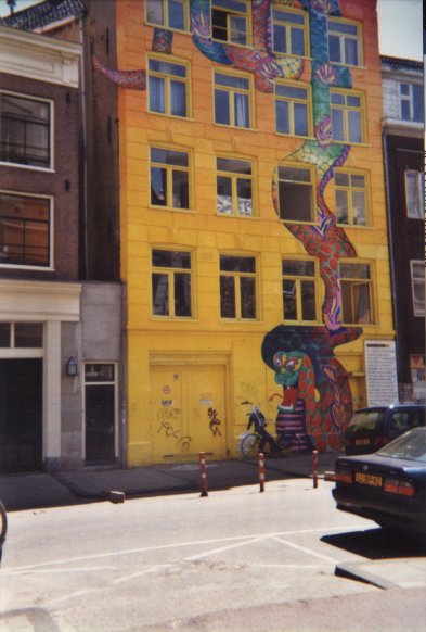 A "kraakpand" (house occupied by squatters, for political motives; people who owned buildings and kept them empty waiting for the price to rise, while the city had serious housing problems, found those houses invaded and taken over by idealists who decried such money-making practices) colourfully painted with the snake of capitalism. The white square to its right, in lettering not visible on this photograph, tells the tale of the inhabitants' legal fight against the owner. Since I don't often go to Amsterdam these days, I've no idea how it ended.