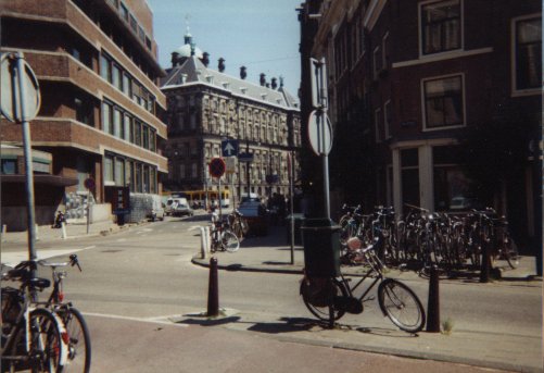 The street (Nieuwezijdse Voorburgwal, if I remember correctly) along which some university buildings were lined up: the "Bungehuis" with its green mosaic interior and rough-stone exterior, cool and hushed as a church, and the modernist see-through "PC Hooft-gebouw" with its glass walls and cleverly designed staggered staircases.