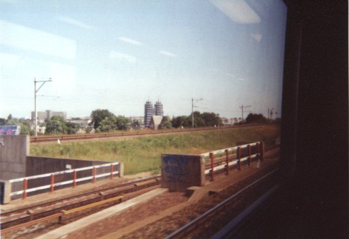 Heartbreakingly ugly buildings along the track, including a set of twin towers.