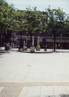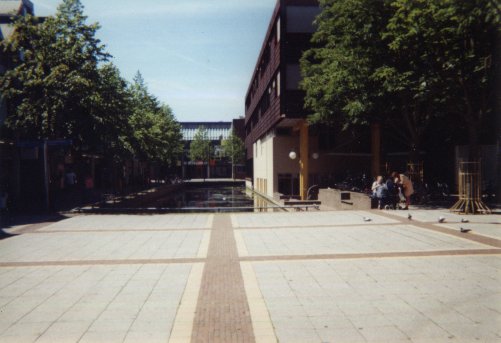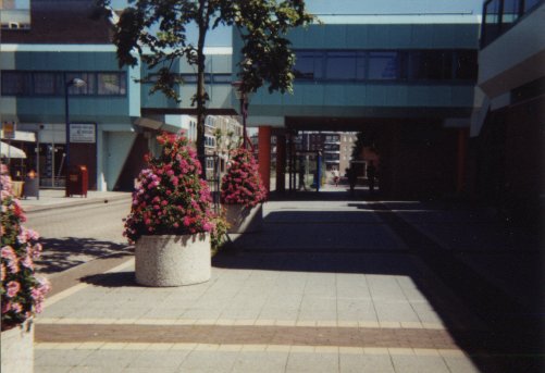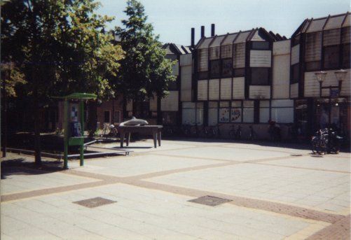 Paving patterns in the shopping centre. Each corner of this square runs off into some entry or exit. The first picture shows the bus stops, so conveniently close to the shops that on leaving one, you bump into the other. The third picture shows an odd statue: a dolphin on a table. The fourth picture shows the public building "Corrosia (de Roestbak)" - corrode, rust, get it, ha ha - seemingly inaccessible behind a body of water.