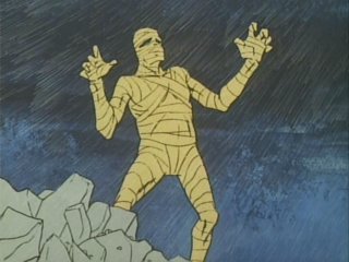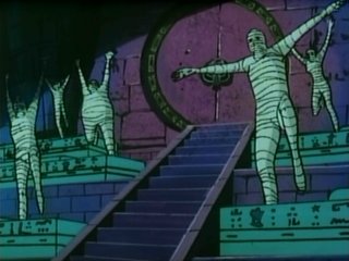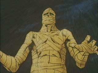 It's been a long time since the beliefs of the ancient Egyptians were practiced on a large scale, so what remains is the popular image of the vengeful mummy. In episode 3, a mummy plucks planes from the sky in one of Galactor's overblown schemes ("We need the invention of someone who may be on a plane, let's smash all the aeroplanes we can find") while in episode 69, the team get their own back by donning mummy disguises and scaring the living daylights out of a bunch of Galactors.
