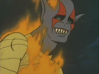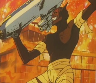 Traditionally, the mummy's big moment is when its bandages come off, revealing whatever is underneath (if anything). In this case, as befits the association of mummies with zombies and the undead, it's a hellish demon, and one who clearly enjoys his job. (Note - since this mummy's bandages were incinerated by missiles, either it has some flame-retardant bandaging or the defence forces were too squeamish to fire at its crotch.)