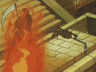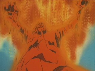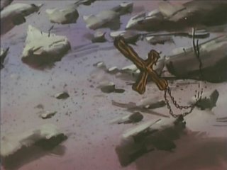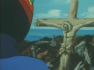 Generally, the makers of Gatchaman demonstrate a clear lack of knowledge on the finer points of the faith (or maybe it's revenge for all those "ninja" films?) while showing they've got the rough idea: meekness, pacifism (take the Crusades, for instance -cough-) and self-sacrifice. When these three qualities have to be represented, with typical Gatch unsubtlety a crucifix is trotted out. A Gatch fan stated her belief that Joe is a "Christ figure", which another fan, a practicing Christian, argued against on the grounds that no religious imagery was used to suggest that. Then again, no religious imagery of any significance is used in this show. The first fan based herself on Joe's falling onto the cross (see the Easter eggs in the Archive, all the way at the bottom). I'd base myself on the fact that he has to die for the world's salvation, twice. Already enamoured of the kamikaze principle, the Japanese have learned from Christianity that there's no publicity like martyrdom.