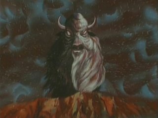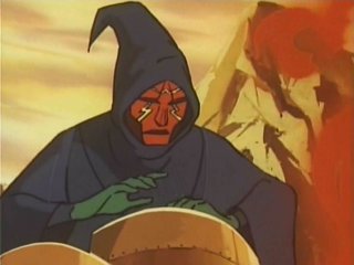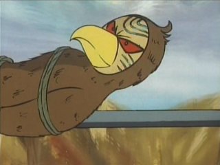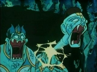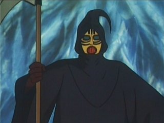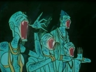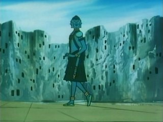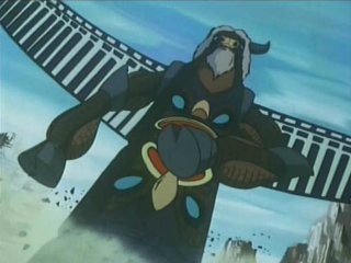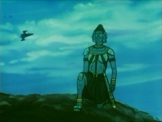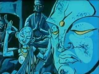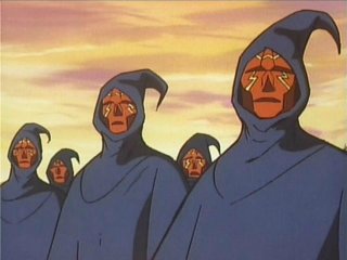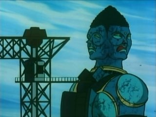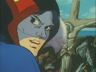 Presumably because it is "Western" and the show went for a Western look, Christianity came off better than most, although the audience has not been spared a rampaging Jesus. The touch of Tibetan Buddhism may be explained by Galactor's HQ being in Cross Karakoram (an existing location in the Himalayas) although that's strictly form (creepy statues) and no content; maybe the statues were intended to make locals believe the base was a holy site, so that they would avoid it. There are no references at all to Japan's established religions, Zen Buddhism and Shintoism, or they're so subtle that I missed them completely. (According to the episode summary on Veronika's Gatchaman page(2), Katze was disguised as a Shinto priest in episode 73; however, a quick websearch on traditional Shinto priest costumes shows nothing that looks like his outfit. Shintoist priests do wear caps with a little tail on top, but it flips forward, not sideways; it looks more like Gel Sadra's headgear!)