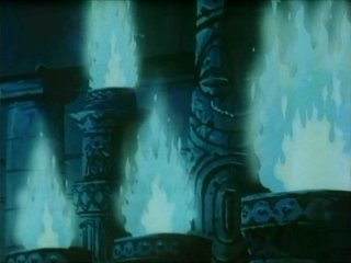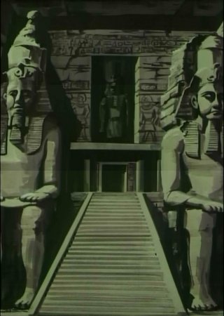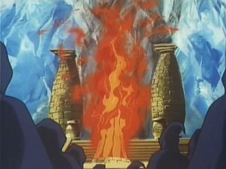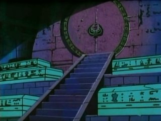 Episode 69: high stairs leading up to a pyramid, and a gaggle of Galactors charging past the hieroglyphs to catch the little kid that snuck in.