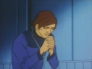 And this while Joe is the one with the churchy friend. Here's a more positive image: Alan, a Catholic priest who gives to the poor (who will be killed by Joe a bit further on for being Galactor spies).
