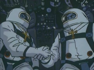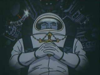 Self-sacrifice in episode 97: knowing their craft would be used by Galactor to blow up a power plant if it wasn't destroyed, two astronauts shake hands, grasp their crucifixes (symbol of sacrifice, possibly a reward in the hereafter?) and prepare to die. The explosion is followed by organ music, the final two ka-chinks being the two crucifixes falling on the ground virtually undamaged, although the craft itself is blown to bits.