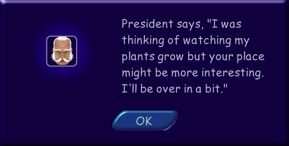 "You're a fan of DN-5?" the president asks. "Well, isn't that a coincidence - they live in Simsville too! In fact, they're practically next-door neighbours!"