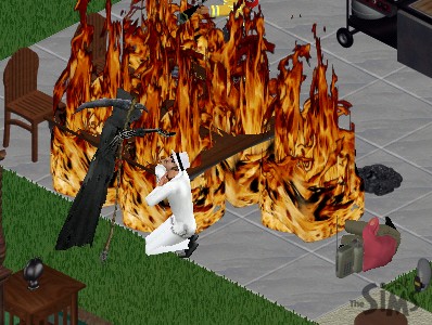 At this thought, the table goes up in flames, hamburgers and all, burning Oniishi, although he stays unharmed himself. Seeing the grim reaper coming to collect his old teammate, he begs to be taken instead.