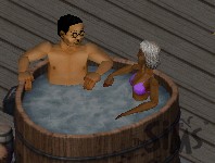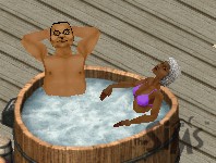 His father likewise is snatching a last bit of quality time in the hot tub with a nice old lady. "Children... They're so active. You don't have children, do you?" He leans back in the tub. "Ahhh... This is the life."