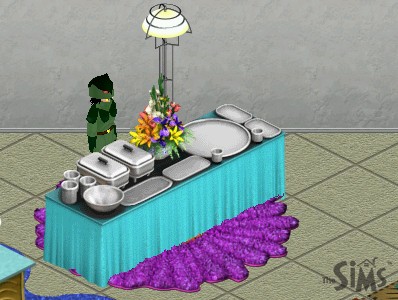 Donald doesn't care about the music and just grabs himself a plate, one table away from the gift flowers.