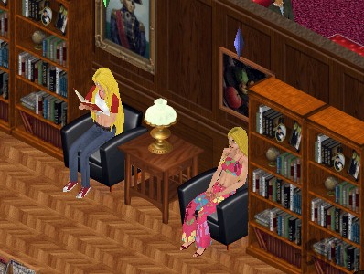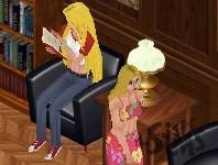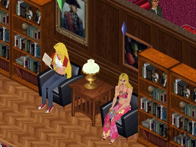 After a bit of sitting on the hard iron chair, the would-be novelist decides that maybe it's more comfortable to sit on the soft plush chairs in the library. Als she goes inside, she sees a very familiar face, tucked deep into a book.