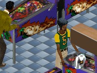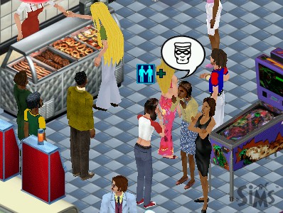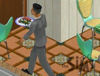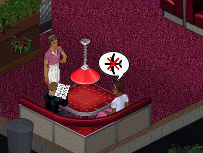 While Joe looks this way and that, his companion is only interested in the fast food bar. "What's a man got to do to get a hamburger around here?"