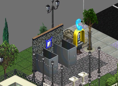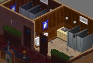 Not at the cabin - wait, there he is, near the public toilets.