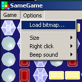 This version of SameGame can be found as USAME.LZH, but I downloaded it via a link on Ang's now disappeared Gatchaman Goodies page as MACIGAME.ZIP, which is the original files plus three Gatchaman/BOTP bitmaps. It is possible to make any number of bitmaps for this game. They sit in the same directory as the main executable and can simply be loaded with "Options|Load bitmap". The text included with the game explains their format: 2 x 5 bitmaps sized 32x32 pixels for the game squares, one 32x32 bitmap for the background and an "empty" bitmap for the artist's name or somesuch. I was delighted to find the game accepts truecolour bitmaps, although, being written for Windows 3, it won't understand long filenames.