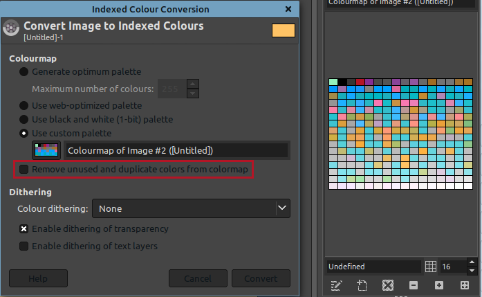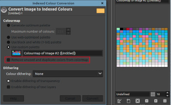 Or, as I ended up doing it in GIMP, this large file is not cut up, but left opened so that its indexed palette will show up in the list of available palettes, and the truecolour images that must become cels are opened one by one, and have their colours reduced by loading this indexed palette, and are saved to GIFs or PNGs. (When colour-reducing in this way, make sure that the box "Remove unused and duplicate colors from colormap" is unticked, because every little image is supposed to have ALL the colours.) But first, I needed to make an image with the right palette file.