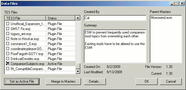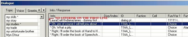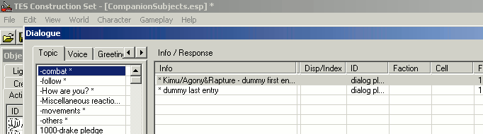 To make plugins work with CompanionSubjects.esm, they have to be torqued a bit. I opened the TESCS, selected "Morrowind.esm", "CompanionSubjects.esm" and the plugin (and "GMST Vaccine.esp" because I have GOTY, in a Morrowind-only installation this is not needed) and set the plugin to Active. The TESCS combined topics for me, so if I loaded "Laura Craft" and went to topic "my studies" I would see a dummy first line and a dummy last line right under the plugin's lines. Now if I go to the dummy first line and move it up to the top, Laura Craft's lines will be attached to the dummy first line, and the plugin will have a new dependency: CompanionSubjects.esm. I do this for all topics followed by an asterix that also contain the ESM's dummy lines.