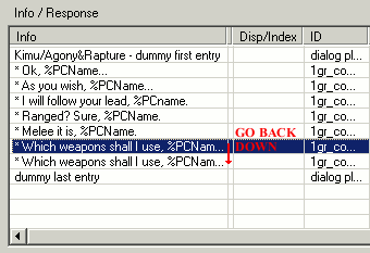 This can be done manually, but that doesn't really work as it's complicated and may cause dialogue lines to double. There is an easier method, which I applied to the "Kimu" and "Indiana James" ESPs as they were the smaller files in the conflicting pairs, so editing them would be less of a hassle. The way to change the ID of a line under a topic is to stand on it, right-click, and choose "Copy". This produces an identical line on top of the old line, but with a different ID. This new line is automatically selected. Select the old line again, and delete it. Now the old ID is gone. Repeat for all lines under the topic. Since duplicating the second highest line changes the topmost "dummy line" again, I cleaned the dummy lines from the mod when done.