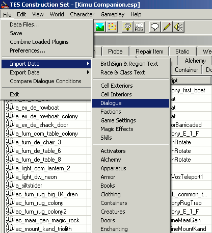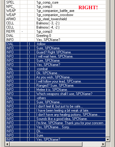 Change of method! I've noticed that when deleting and importing completely new topics of any kind (journals spring to mind) the strings are imported in reverse order. This doesn't matter for journals, but it does matter for added dialogue where the most generic response should be at the bottom, not at the top. This doesn't apply to existing topics, whether standard game topics or topics added by CompanionSubjects.esm, where the strings are added to an existing topic and so have insertion points. Therefore, "new" (existing only in the mod) topics should not be imported, and if I strip those out of the import file, I might as well strip out all other unneeded stuff: journals, greetings, voice and any standard topics like "Background"; this makes a much smaller import file. It also means less dialogue-cleaning afterwards, as any topic not imported also doesn't need to be cleaned up. So now, the method is not to delete all dialogue, but only to delete the topics that exist in CompanionSubjects.esm. Lists of topics to delete per companion mod can be found at the bottom of this page.