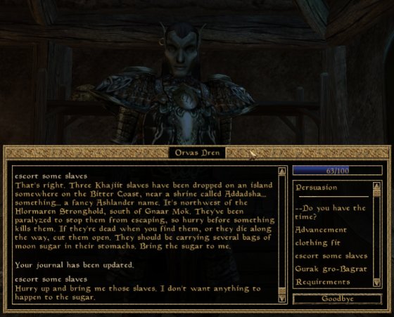 | Odds And Ends | Morrowind-only: fixed small stuff, changed some Telvanni and Morag Tong quests. See readme for details. Made to work with ErrandsForOrvas. (Updated 26-08-2014 to fix small script errors and add kiss sound for Nels Llendo. And on 12-10-2014 to move the affected scripts to the ESM.) |