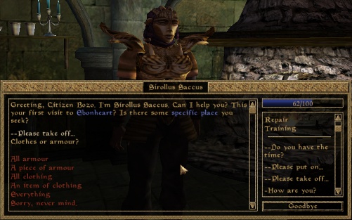 | Take off/Put on | A plugin for Tribunal and upwards to make smiths, merchants etc. take off anything you don't want them to wear (like that helmet you just sold them) and put on anything you regret telling them to take off. (Updated 13-01-2011: now using GetArmortype to remove only what armour is actually worn.) NB. With the Morrowind Code Patch, merchants no longer equip the armour they sell, but it is also no longer possible to make them don armour. |