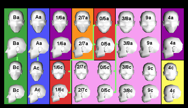 The following picture shows all AS models, connecting with arrows the child heads that are simply a shrunk version of a adult head, and giving the same background colour to models with sufficiently similar UVmaps to share a texture.