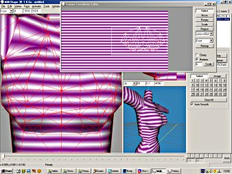 The first bust add-on was made from the W505FAFit Uber chest with added vertices. Its centre is slightly raised to avoid intersection with the also slightly raised central FAFit chest vertices. Its outer vertices were placed to blend with the upper and side vertices of the normal FAFit chest. Its texture map was shuffled around to match the texture map of the mesh alternately called nude/swimsuit (old Sims), S100FAFit (HDplus Sims) or B300FAFit (swimsuit skin pack). The texture itself was also edited a bit. Because the mesh has "-BODY" in its name and is connected with the body mesh through the CMX file, it uses the same texture as the body mesh.
