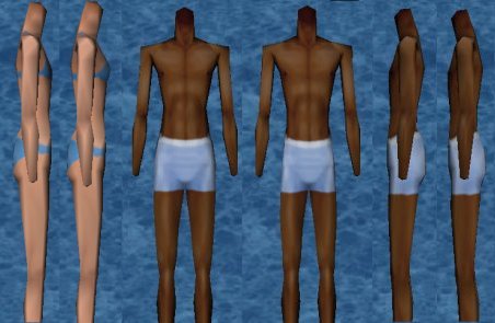 | bskswim.zip | Replacements for the skinny F/M nude/swimsuit defaults, with flat hips for the male body and a bust for the female body. Needed in both HD and pre-HD installations. | 30-08-2004 | These overwrite the B300 meshes, if present. Make backups if you want to keep the originals. | The old and new skinny bodies compared. |