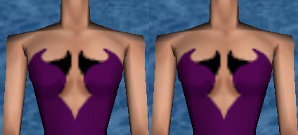 | f100fa.zip | The B325/F100 mesh, unchanged in shape, but with a nasty texture map irregularity on one shoulder fixed. No more asymmetric gowns! | 03-12-2006 | The game only offers B325FaFit, but as the B325 mesh is the same as the F100 mesh, which comes in three sizes, I've done some copying and renaming so that female Sims of all sizes can wear the "blue fractals" gown. | A closeup of the fit formal chest, before and after texture map adjustment. |