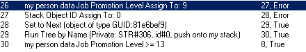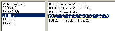 Looking at line 29: this takes a name from a STR# resource, tries to find a routine of that name in the object whose GUID is currently the stack object ID, runs it if possible (True if found, Error if not) and then continues its own routine. This is convenient for when one object must run the same routine in different objects, for instance, when testing every object in the room for the "Am I a mirror" routine, which may have a different BHAV number in each object. Unlike dialogs, which can only use strings from STR#301, named tree strings can have their STR# number specified. The usual named tree resource is STR#303, but to be on the safe side, I'm using STR#306, which I haven't seen used anywhere else, so that this resource won't clash with possible STR#303 blocks in NPCs that refer to PersonGlobals in their GLOB blocks. Hexadecimal parameter 5 determines the string number, while parameter 6 can have values 0 to 2: run in my stack, run in stack object's stack, push onto my stack. Hex parameter 3 can be odd or even, the first meaning "Global" and the second "Private". If "Private", STR#306 will be looked up in PersonGlobals, else, it will be looked up in Global.iff, where it won't be found. At the moment it won't be found in PersonGlobals either, so I'll add it: