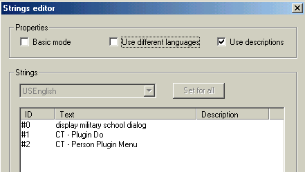 Am I done yet? No, because I told the dialog to use the 26th string in STR#301, and STR#301 has no such string. So I add a 26th entry and copy and paste all language strings "$Me is off to military school!" from PersonGlobals' snapshot texts in STR#305, to ensure that the new dialog is multilingual. Hacking such basic parts of the game is no use if the hacks only work for English users! The end result: