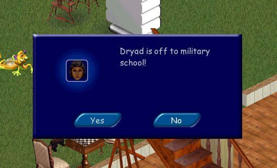 First, an analysis of the military school check in BHAV8312 of PersonGlobals. This tree is only entered if the "my person" Sim is a child, and its very first line checks if school marks are higher than 13 (remember, 0 is A+, 3 is B+ and so on; "F" covers 12 to 15). If so, checks follow to see if the Sim is ready to leave (ie. not sitting or sleeping), then the tree jumps from line 23 to line 7: school money is subtracted, then to line 1 and 2: the Simchild is deleted from the family, then a lot of jumping between lines as the child dresses in uniform and a possible snapshot is taken with the caption "[name] is off to military school!" and the routine ends in line 4 "(glob) Set to leave" which calls "PedPortal.iff" containing the child's sobbing goodbye. The child, by that time, no longer exists as a Sim; any dialog should be inserted before line 7. A quick way to disable military school altogether is to make both outcomes of line 0 True. This may slow the game, as the child's grade continues to be F and PersonGlobals is therefore directed to BHAV8312 every second, only to be blown off. (I tested this, and it doesn't slow the game on computers with a 1Ghz or faster processor.)