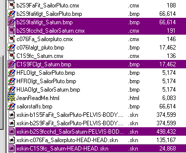 The Hot Date buyable strings have made it easy to change the pyama, formal and underwear/swimsuit strings, but are ignored by Livin' Large and House Party, and for the purpose of this section, I shall ignore them also. My mission is to give Sailor Saturn, who I created as an adult though I later found out the skin was for a child (result: I couldn't find the right head!) the proper head and, to save time, the proper body. Looking up the names of the CMX and skin files, I saw what had caused my mistake in the first place: