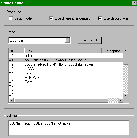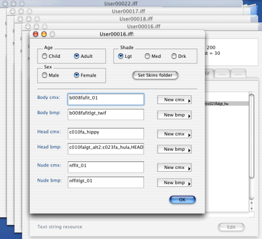The format for the head and normal-clothes strings is: CMX filename; comma; body part in capitals followed by "=" (and this will be either BODY or HEAD-HEAD, HEAD-HAIR is not usually included) and the BMP filename. The file extensions are left off. The mesh filename, starting with "xskin-", is in the CMX file. The CMX and BMP files have to exist, and match each other, and match the gender, age and colour (no "fa" for a child!) or the game puts a new CMX and BMP in strings #2 and/or #3; the old strings are stored behind a semicolon on the same line. When manually editing the bodystring, these are best deleted, as they can get in the way and make the game believe another invalid combination was chosen, and again pick new skins, which are probably not the skins intended. When all the right filenames are entered, save the file and start the game to see if the character has the right skin.
