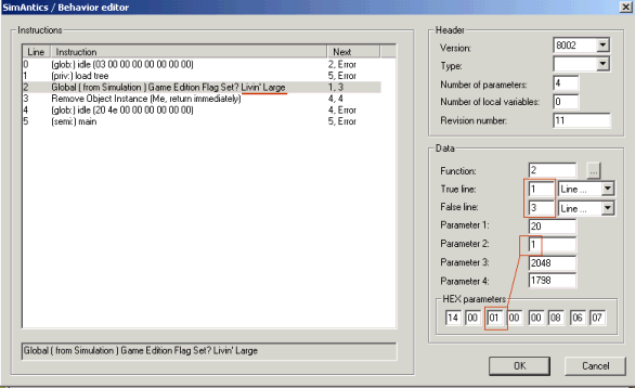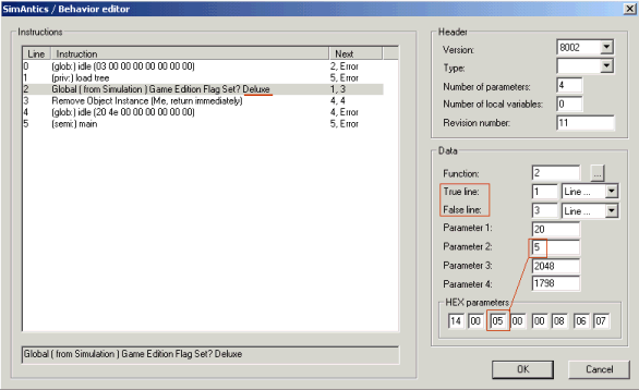 This code does the following: when the object is "refreshed" in live mode, the code checks if the running game is of or above a certain version, and if not, the object deletes itself. Technically, this happens in the "main" routine, so in each object, the block of code to look for is the one called "main", allowing for variations; in the windows IFF it's called "main - Part 1", while in the doors IFF it's split in two: "main - Part 1" and "main - Part 2". To see what it looks like in the IFF editor, open one of the Deluxe IFFs in IFF Pencil, double-click on BHAV to get only the BHAV code blocks and select what looks like the "main" routine. Double-clicking this routine brings up the code for object initialization. Look at line 2, the highlighted line: the instruction asks, is this version Deluxe (or higher)? If so, go to line 1, if not, go to line 3. And line 3 effectively says: delete object and quit.