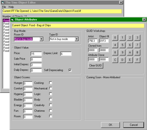 Of the subsequent fields, only the first price field needs to be filled, the second one can be ignored. Things like depreciation values have little meaning for items like food, although Sims may apply the "value judgement" (a routine which checks for current price, and uses the depreciation values) to a bought slice of pizza and go "it's not worth a lot of money, so I don't like it!" The object scores, lastly, have nothing to do with the object's effect on the Sims and are only there for the catalogue. For food, it may be appropriate to fill in 1 for Hunger.