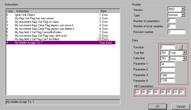 To make the pedestrian portals invisible, some code needs to be added to the "init" code block, number #4101 in the BHAV block. To get there, open "PedPortal.iff" in IFF pencil, click on "BHAV" in the left window, then on the line numbered "#4101" in the right window, and the editing window will open - we're ready to do some programming! In the left half of the editing window, right-click and choose "Add". A new line will appear, with some nonsense equation in it. Not a problem. Look at the line above it, line #7. This is the last line and its outcomes are True, Error. But now line 8 is going to be the last line, so select line 7 and change the True value to 8 by putting "8" in the True line field in the Data rectangle to the right. Then select line 8 and use the drop-down box (that's most convenient) to set line 8's True line and False line to, respectively, True and Error. In the Function field (topmost field of the data rectangle), fill in a "2" if it wasn't there already. Next, in the fields marked "Parameter 1" to "Parameter 4", fill in the following numbers in this order: 31, 1, 1280, 1795. (You can also fill in the eight squares below if you're feeling adventurous, it's the same four numbers displayed in hex.) And now, the writing for line 8 changes to something that suggests the portal will now be invisible.