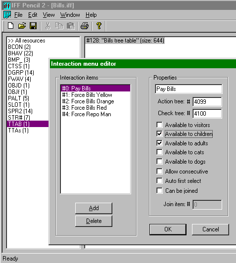 This is how it's done: extract "bills.iff" from GameData/Objects/Objects.far, open it in IFF Pencil and click on TTAB to get only the resources connected with the menu options, then on "Bills tree table" for the possible interactions. As can be seen, the box for "Child" is unticked, so that this menu option will not appear for children. Click it to tick it, and children will henceforth be allowed the action "Pay Bills".