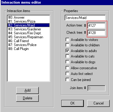 The adult-only phone options in "Phones.iff" can be made available to Simkids in the same way, although plugins, like that for calling the pest control people in Unleashed, can be a bit tricky, because the menu items aren't exactly where one expects them. Still, children can now employ a maid and gardener and call a repairman; and even a cab, if Unleashed has been installed. NB.: "Phones.iff" is one of those IFFs best taken and hacked from the Sims version you have installed - the hacked "Phones.iff" from Unleashed, when put in an LL installation, will crash the game!