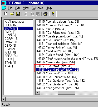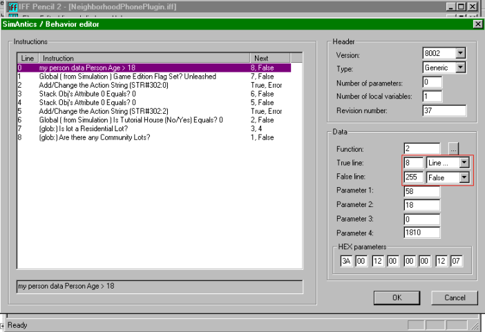 The highlighted line, and the rectangle with the two fields outlined in red, is what stops children being able to call cabs. The line says: "If the person calling is an adult, continue with line 8. Else abort." I can change that, of course, to "If the person calling is an adult, continue with line 8; if not, ditto." I simply enter an 8 in the second "go to" box, too. Provided the "Call Cab" option has been made available to children in the Unleashed version of "Phones.iff", cabs are now available for children. That is, to transport them to community lots. Once they're on a community lot, they can't call a cab to go back, because the only telephones available are payphones, and these are in a different IFF file: "PhonePayNeighborhood.iff". Open this IFF and make "Call Cab" available to children in the same way as in "Phones.iff", and they can also call a cab to take them home. (Note: "PayPhoneNeighborhood.iff" and "NeighborhoodPhonePlugin.iff" are from ExpansionPack5/ExpansionPack5.far, and that's the folder where they should be put. Don't put them in GameData/Objects, or they won't be loaded.)