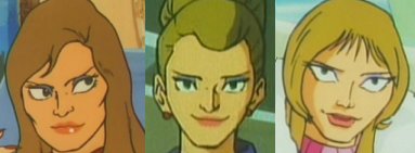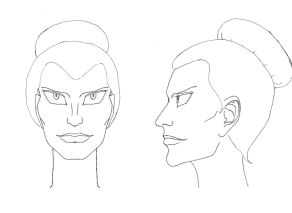 After a bit of sketching, I found that the female form (henceforth abbreviated "FBK") had roughly four faces: the long, oval face one might expect to see under the mask, with large, frightening eyes (taken from Amano's character design, see the Gatch scans in the Archive); an older, more square-jawed "dowager duchess" look in the Gezora eps and ep 70 (the only episode which consistently maintained a style from earlier episodes, and which contains the best-drawn, IMO, FKB face shot of the whole series); the "fashion model" look of ep 46, and the "oh I dunno, let's draw an Evil Woman" look of eps 88 and 102, which can further be divided up into respectively the triangular style and the round style, both of which have nothing "Katze" about them, not even in the absurdly large and supposedly intense eyes. Perhaps uncoincidentally, unlike the earlier FBKs who displayed their gender-neutral nature (and remarkable leg length) by wearing trousers, the generic Evil Women wear skirts, don't show much leg and seem to have shrunk to a more conventional length.
