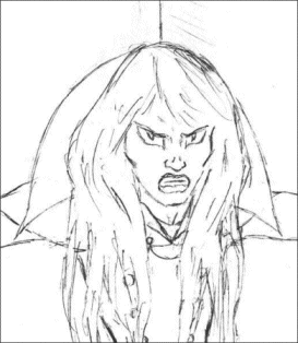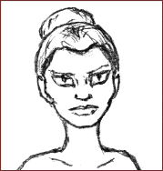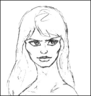 Here is where (IMO) things start to go wrong. Big hungry eyes: check. Asymmetrical hair (not really a requirement, though): check. Hollow cheeks: well, sortof, and the curiously depressed eyebrow shape is also there. But for the rest, the picture looks... flat.