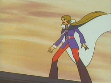 Next, and in the same style, is Monorail Mala (aka the Hostess from Hell) who reminds me of a praying mantis, looks as if she ought to have fangs, and does a downright Dracula when she whirls off her cape to reveal her Galactor captain's uniform. As BK, this was supposed to be Anderson's secretary, which would be credible if she'd claimed she was also his bodyguard. (Click here for the animated gif.)