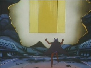 Now comes a painful moment, so why not record it in some painful sounds and pictures: the demented laughter (Katze's this time) at the mere notion of stopping X's death machine, and his final words: "Die, everyone! Die!" before he jumps into the lava pit. (ep 105)